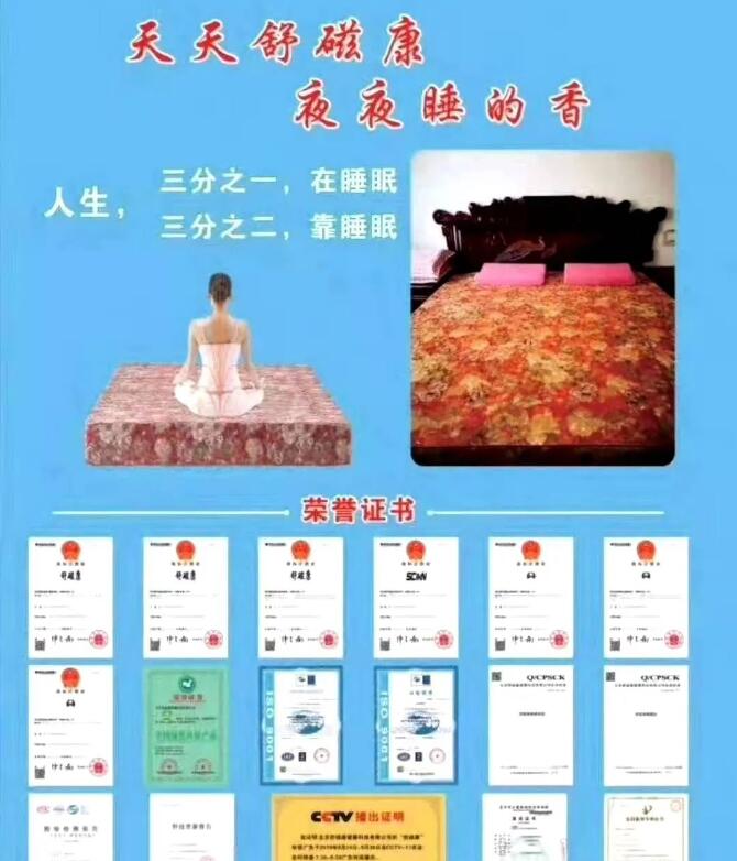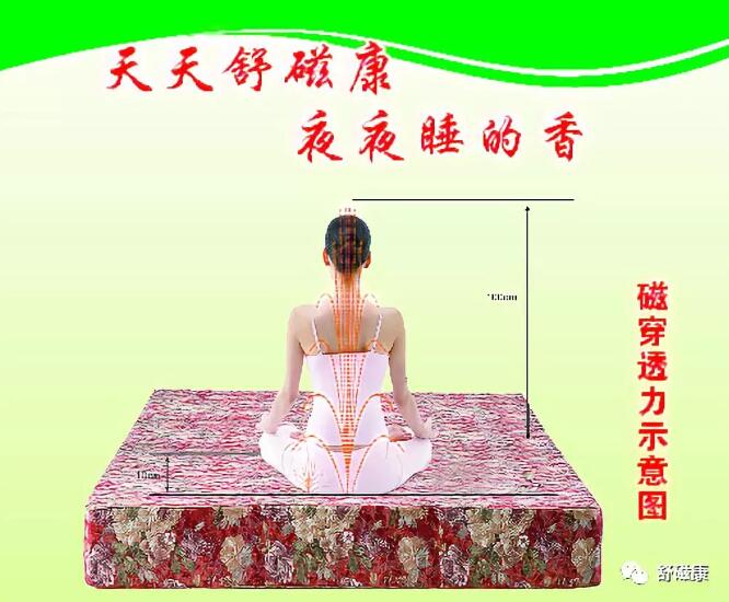 它的面料考究,提花刺繡,上面有舒磁康標識。就象我們穿的毛衣,如果是化纖的,在脫的時候,是不是會有靜電,靜電偷走了我們的負電荷,使紅細胞聚集,對我們的健康危害很大。而舒磁康地磁床墊,一是防靜電,再一個圖案非常漂亮,所有人都喜歡牡丹花,它的立體感和層次感都非常強。有直觀的防偽作用。
